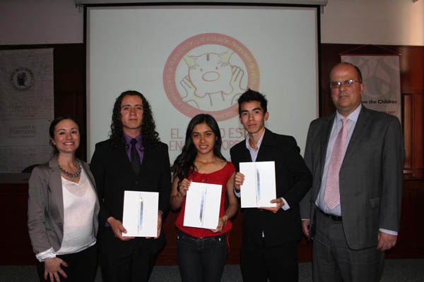 El Gerente General del Banco de la República, Dr. José Darío Uribe y la coordinadora del proyecto YouthSave de Save the Children, Alejandra Montes, presidieron el acto de premiación del concurso de video “El Ahorro es Importante” en el que se entregaron tres IPADS al grupo ganador en la categoría de mejor video conformado por Christian Hernando Barreto Pérez, Viviana Maricel Gutiérrez Paez, Johan Sebastián Aguirre Bolaños.
