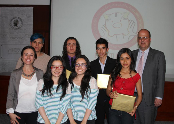 Ganadores del concurso de video “El ahorro es importante” en compañía del doctor José Darío Uribe, Gerente General del Banco de la República, y la coordinadora del proyecto YouthSave de Save the Children, Alejandra Montes.