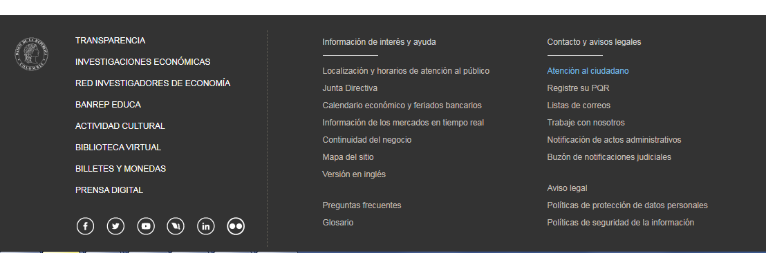 Imagen de página web del Banco de la República, con énfasis en la dirección y el menú de Atención al Ciudadano.