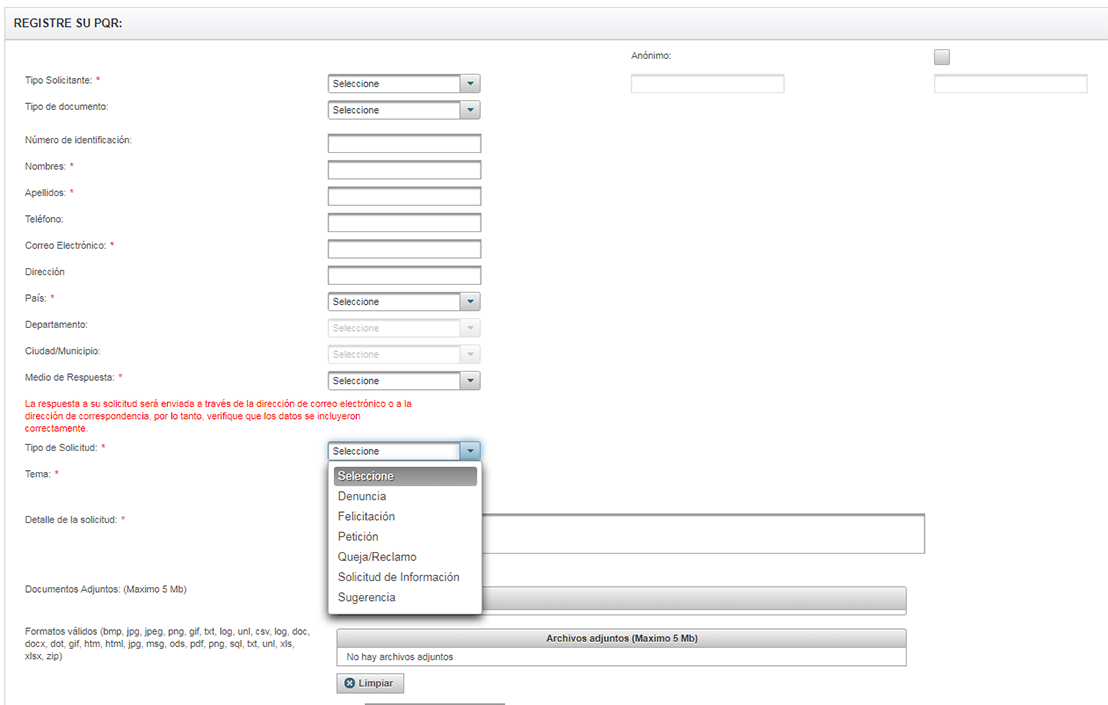 Si usted desea radicar su denuncia como usuario anónimo, seleccione la opción correspondiente y diligencie el formulario: