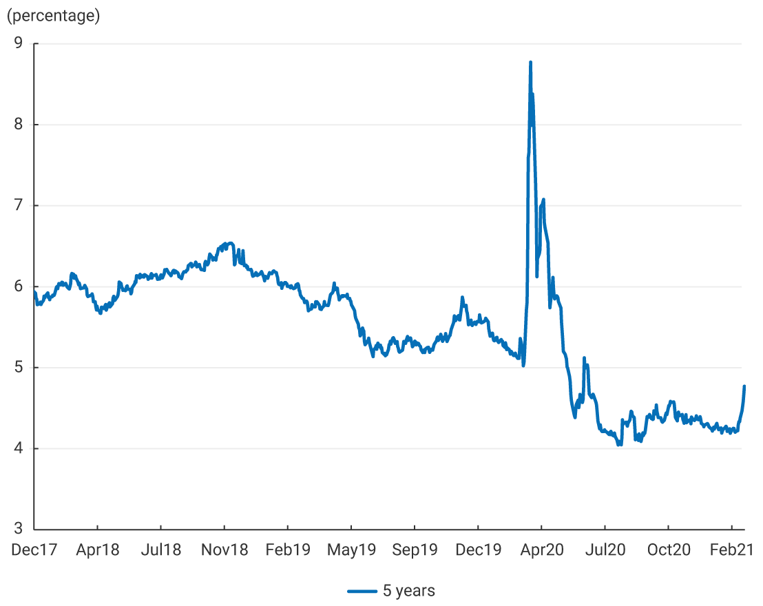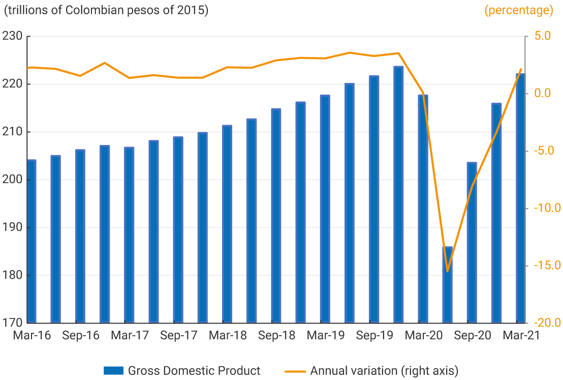 The stimulus offered by monetary policy and the National Government's transfers to entrepreneurs and consumers over the course of 2020 strengthened domestic demand, which was severely hit at the beginning of the pandemic. This policy response initially contributed to a recovery trend starting in the third quarter of 2020, as social distancing measures were relaxed (Graph 3). This trend was accentuated in the first quarter of 2021 when the economy grew by 1.1% and by 2.0%, if the figure is adjusted for calendar effects associated with the dates on which public holidays occurred each year. This result was above the expectations of independent analysts and the forecast of Banco de la República’s technical staff. The expansionary monetary policy implemented by Banco de la República has been a key element in inducing this economic recovery process, and in the absence of other shocks, it will continue to boost it in the remainder of 2021.