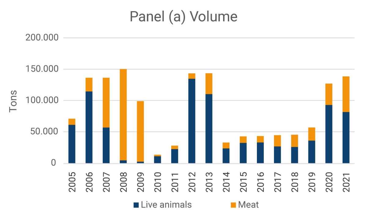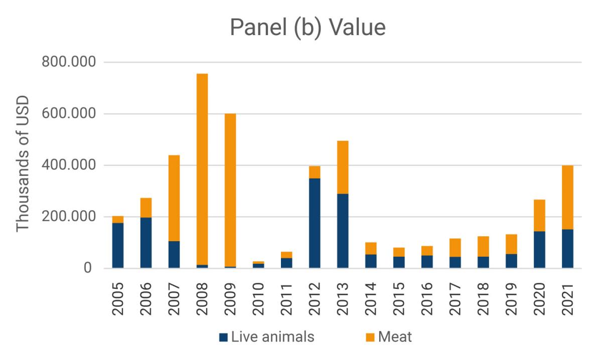 Regarding demand, in 2021 the beef market was impacted by the strong aggregate consumption in the economy, which grew 14.1% and reached values higher than the trend before the pandemic. In addition, export demand has grown significantly since 2020 and is expected to continue to do so in the future following the recovery of Colombia's foot-and-mouth disease-free status in October 2020. As can be seen in Graph 3, the volume exported in 2020 grew at an annual rate of over 100%. During 2021, the growth moderated, but its value had a proportionally higher increase due to the increase in prices.