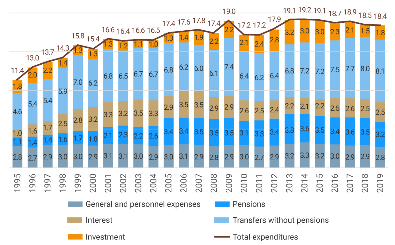 The first evidence of this phenomenon emerges when observing the evolution of the different CNG expenditure items during the last twenty-five years, as presented in Graph 1. This shows a relative investment stagnation in GCF, which contrasts with the growing trend in transfers and pensions. Indeed, CNG investment remained around 2.0% of Gross Domestic Product (GDP) between 1995 and 2019, while transfers increased from 4.6% to 8.0% of GDP, and pension spending rose from 1.1% to 3.5% of GDP. The relative stagnation of government investment is confirmed when observing its share in primary expenditure (total expenditure excluding interest), which registers substantial cycles but without a clear trend during the period analyzed (Graph 2). The lack of dynamism in government investment is part of the so-called bias against capital expenditure. This phenomenon, characteristic of many developing economies, prevents investment from acquiring greater importance within primary expenditure.
