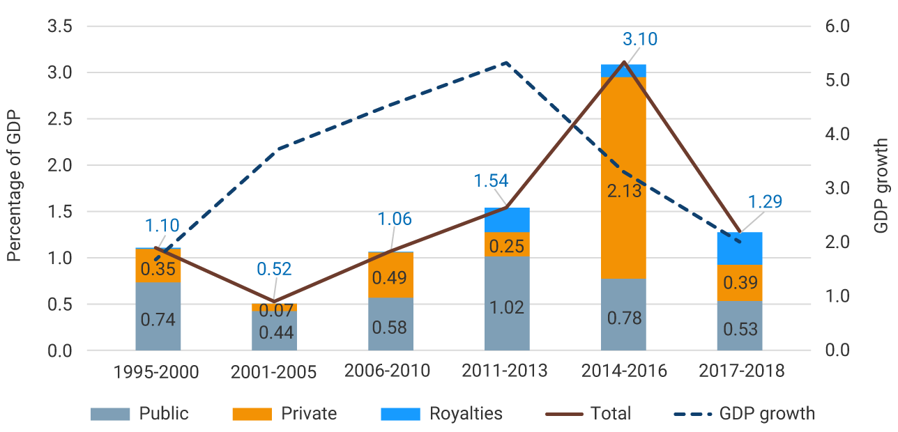 In addition to its long-term stagnation, CNG spending on GCF exhibits a clear procyclical behavior (Graph 3). Thus, during 1998-2004, in the context of a GDP contraction of 4.2% in 1999, followed by a slow recovery, government investment fell from 2.2% of GDP in 1997 to a minimum of 1.0% of GDP in 2004. Years later, when economic growth slowed from 5.1% in 2013 to 1.4% in 2017 as a result of the oil price drop, investment declined significantly from 3.2% of GDP in 2013 to 1.5% of GDP in 2018. In contrast, between 2005 and 2013, when the economy benefited from favorable terms of trade due to high oil prices (temporarily interrupted by the 2009 international financial crisis), government investment progressively increased to reach a peak of 3.2% of GDP in 2013.