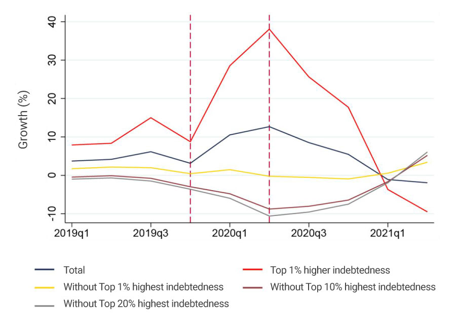 Excluding the top 1% of firms with the highest growth in commercial debt and analyzing the rest of the companies2 the yellow lines in Graph 1, Panels A and B, are obtained. As can be seen, commercial loans to this non-top 1% of firms are relatively stable and, as of the fourth quarter of 2020, show a mild acceleration. If, instead of the top 1%, the top 10% or top 20% of firms that took on the most debt in that period are excluded,3, the violet and gray lines, respectively, are obtained. In this case, there is a drop in commercial loans in the first half of 2020 and a vigorous recovery thereafter with annual nominal growth of over 5.0% in June 2021, in line with increased economic activity.