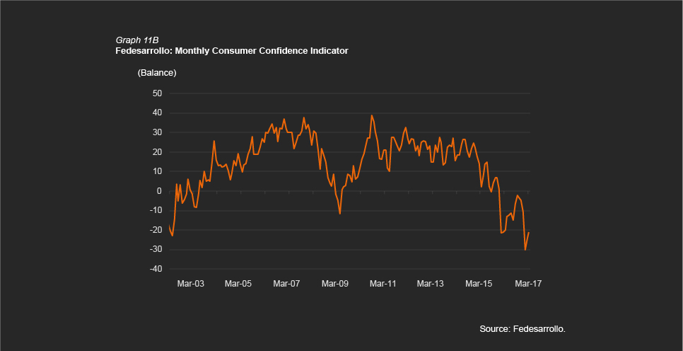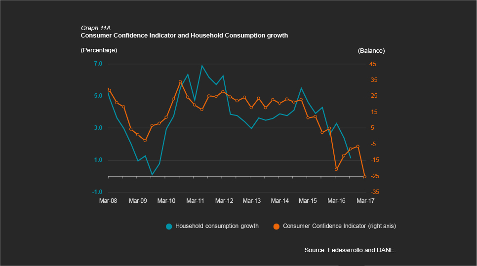 | So far this year, recent indicators of economic activity such as retail sales, industrial production, and consumer confidence suggest that the economy has continued to weaken (Graph 11). Particularly, the low levels of household confidence observed could affect consumption plans for the rest of the year. The unemployment rate has exhibited slight variations since mid 2016. |