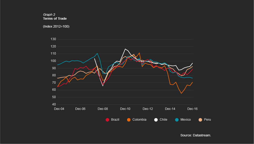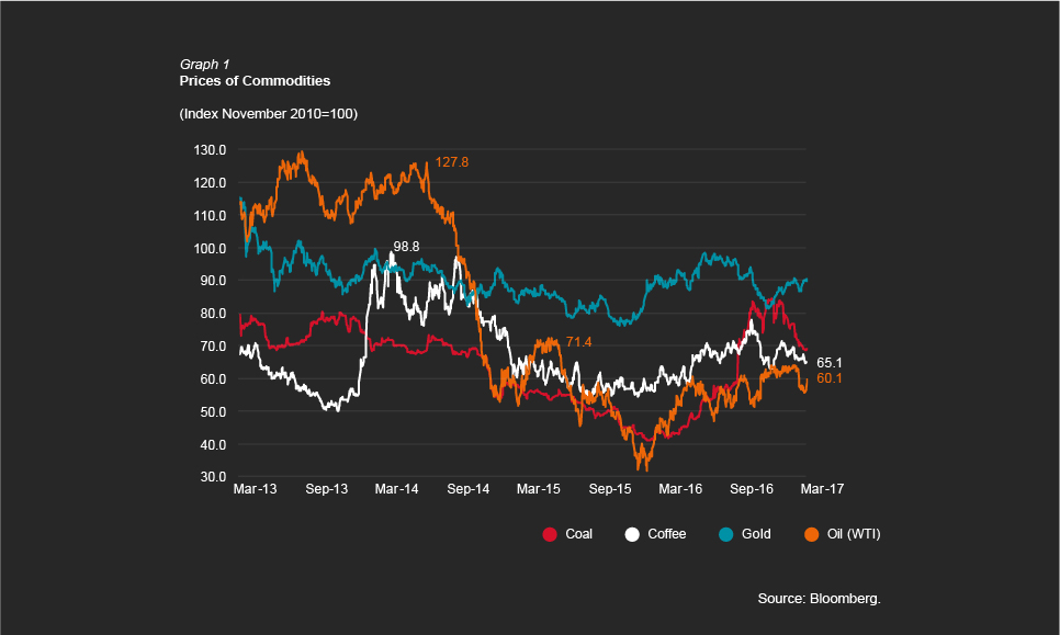 The fall in the terms of trade faced by Colombia since the second half of 2014 and that deepened in 2015 originated mainly in the surprising, strong fall of the international price of oil. The decline between the third quarter of 2014 and the first quarter of 2016 was close to 70%, at which time prices began to rise vis-à-vis the lower levels of global production1. The price for WTI oil stepped down from USD 97,6 per barrel in 2013 to USD 44,5 per barrel in 2016, on average. So far in 2017, this price has posted around USD 52 per barrel, on average. The prices of other products exported by Colombia also recorded declines, although not of the same magnitude as oil (Graph 1). |