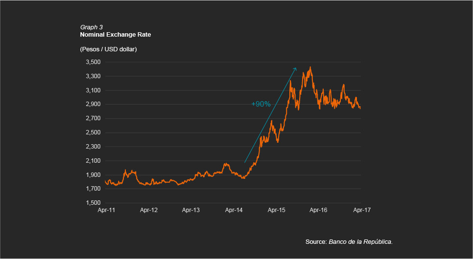 | Lower external revenues (both from exports as from lower foreign direct investment5) along with the increases in the country's risk premia generated a strong nominal devaluation of the peso. The exchange rate (the value of dollars expressed in pesos) increased by almost 90% between mid 2014 and February 20166, when it reached a maximum level above 3,400 pesos per US dollar (Graph 3). The strong accumulated depreciation of the peso and lower growth in the economy led to a marked reduction in imports, thus becoming the main factor for the lowering of the current account deficit, moving from 6.4% of GDP in 2015 (USD 18,922 million) to 4.4% (USD 12,541 million) in 2016 (Graph 4). |