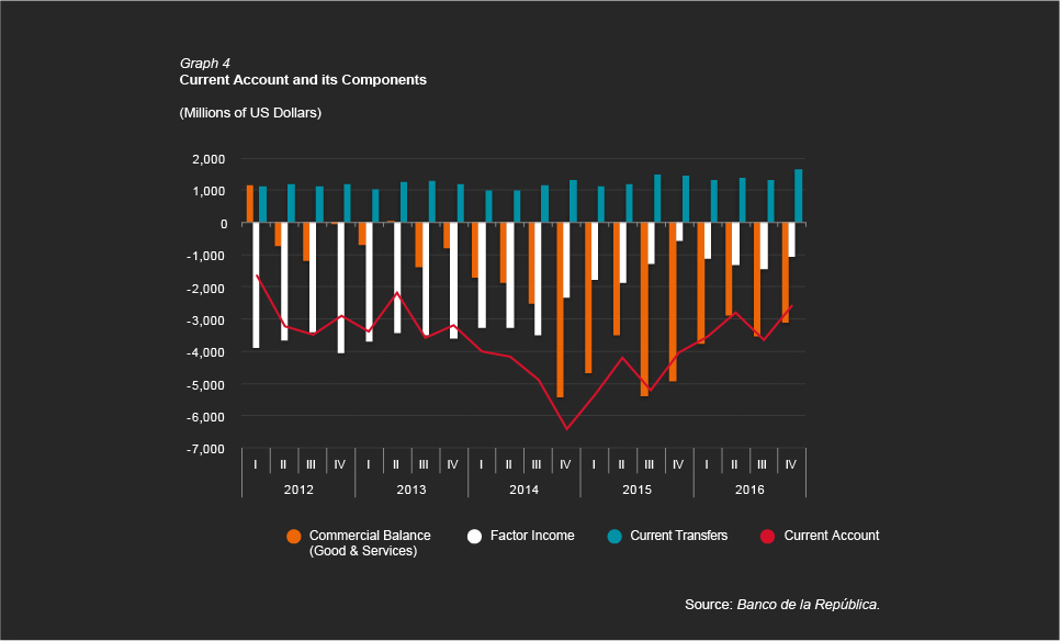 | Oil revenues accounted for about 20% of the National Government's total income in 2013 (3.3% of GDP), 6.9% (1.1% of GDP) in 2015, and virtually disappeared in 20167. Partly for this reason, the fiscal deficit moved from 2.4% of GDP in 2014 to 4.0% in 2016, in spite of the adjustment in current expenditure and investment, and of the increase of certain taxes8 proposed by the Government and processed by the Congress. The larger deficit and the high interest payments generated by the depreciation increased the Central Government's debt from 35% of GDP in 2013 to 44% in 2016. The external and fiscal adjustments, as well as the loss of dynamism of national income, resulted in a deterioration of domestic demand, which along with a weak external demand led to a slowdown in growth that went from 4.4% in 2014 to 2.0% in 2016. Particularly, lower household income, adjustment of public expenditure, higher financing costs, real depreciation, and the fall in consumer confidence explain the weakening of domestic consumption. Similarly, investment was affected by the reduction in oil and mining projects, by the adjustment of public investment, and by lower imports of capital goods due to the depreciation of the peso. |