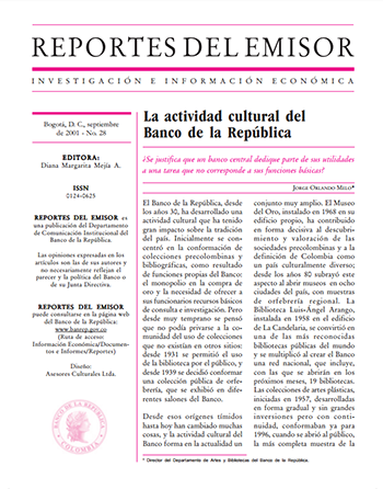 El Banco de la República, desde los años 30, ha desarrollado una actividad cultural que ha tenido gran impacto sobre la tradición del país. Inicialmente se concentró en la conformación de colecciones precolombinas y bibliográficas, como resultado de funciones propias del Banco: el monopolio en la compra de oro y la necesidad de ofrecer a sus funcionarios recursos básicos de consulta e investigación. Pero desde muy temprano se pensó que no podía privarse a la comunidad del uso de colecciones que no existían en otros sitios: desde 1931 se permitió el uso de la biblioteca por el público, y desde 1939 se decidió conformar una colección pública de orfebrería, que se exhibió en diferentes salones del Banco.