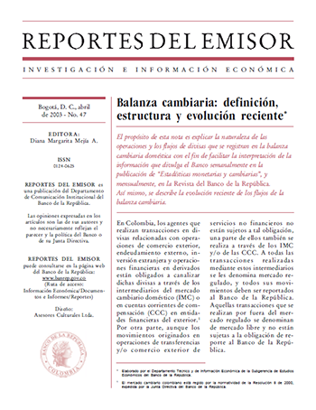 El propósito de esta nota es explicar la naturaleza de las operaciones y los flujos de divisas que se registran en la balanza cambiaria doméstica con el fin de facilitar la interpretación de la información que divulga el Banco semanalmente en la publicación de “Estadísticas monetarias y cambiarias”, y mensualmente, en la Revista del Banco de la República. Así mismo, se describe la evolución reciente de los flujos de la balanza cambiaria.