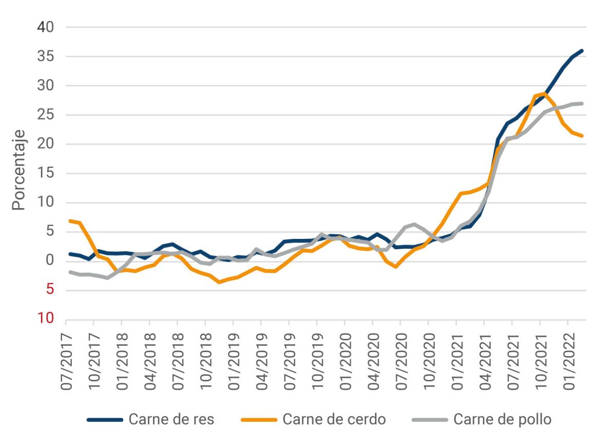 Como se discute en un recuadro del más reciente Informe de Política Monetaria del Banco de la República (ver informe acá), un factor adicional que aumentó la demanda de carne de res en 2021 fueron los choques de oferta que afectaron la producción de cerdo y pollo. Los choques fueron consecuencia del aumento de los precios del alimento importado, sobre todo de la soya y el maíz, y los bloqueos viales durante el paro nacional que afectaron la capacidad productiva del sector en el mediano plazo. Aunque estos choques no afectaron directamente la producción de carne de res, tuvieron un efecto indirecto sobre su demanda vía el aumento en el precio del cerdo y el pollo que son bienes sustitutos.