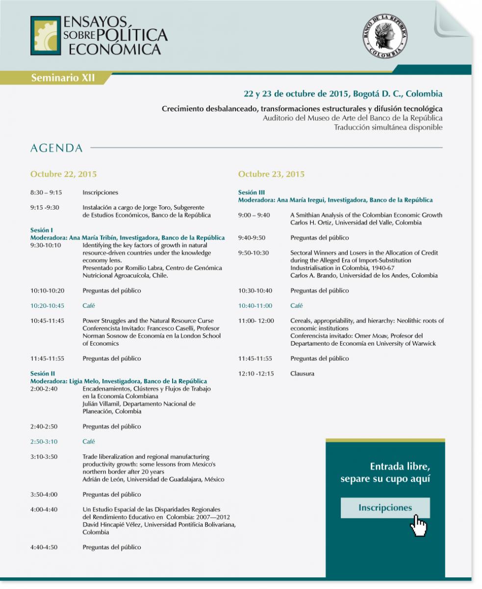 Con motivo de su duodécima edición especial, la revista Ensayos sobre Política Económica (ESPE) del Banco de la República lo invita al seminario sobre crecimiento desbalanceado, transformaciones estructurales y difusión tecnológica que se llevará a cabo los días 22 y 23 de octubre del presente año en el Auditorio del Museo de Arte del Banco de la República en Bogotá.