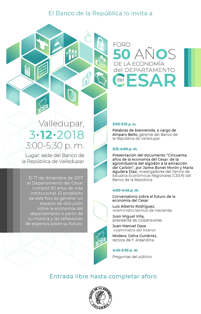 El 17 de diciembre de 2017 el Departamento del Cesar cumplió 50 años de vida institucional. El propósito de este foro es generar un espacio de discusión sobre la economía del departamento a partir de su historia y las reflexiones de expertos sobre su futuro.