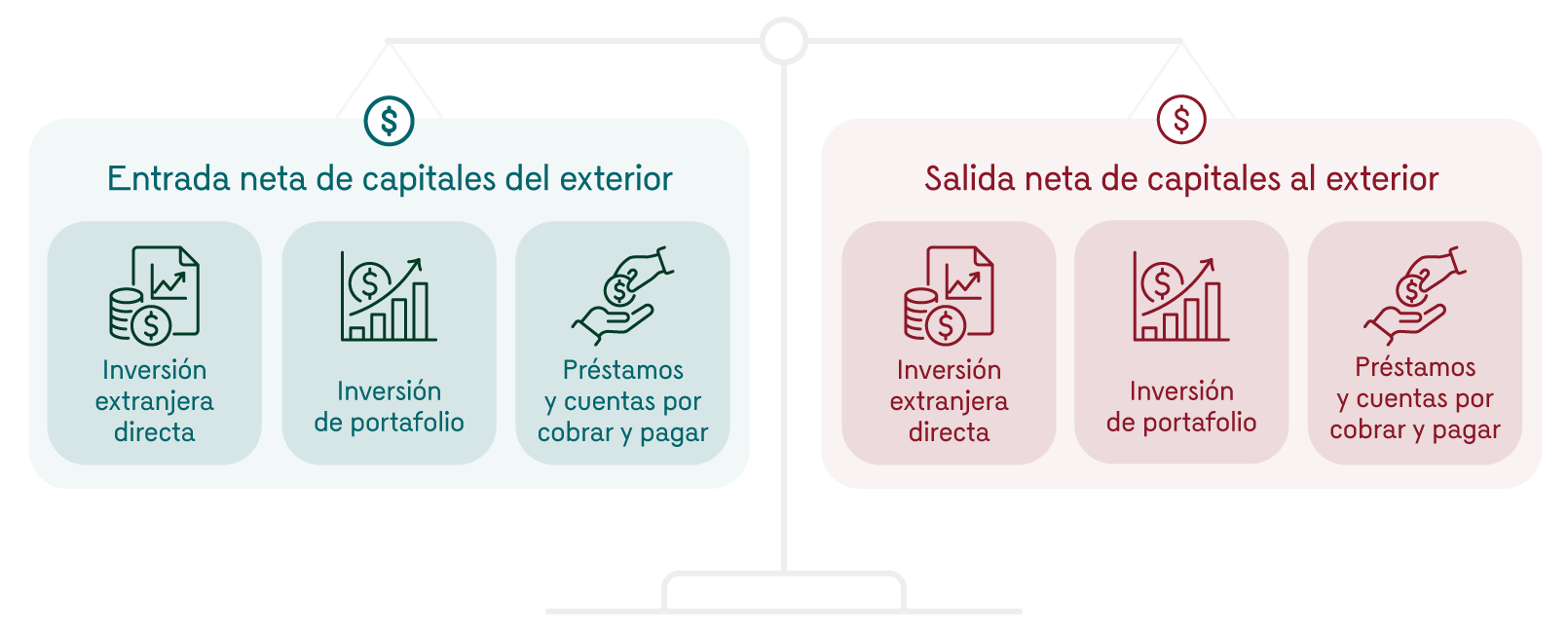- Como la diferencia (resta) entre la entrada y salida neta de capitales a Colombia desde y hacia el exterior (que incluyen la inversión extranjera directa, la inversión de portafolio, los préstamos y cuentas por cobrar y pagar).