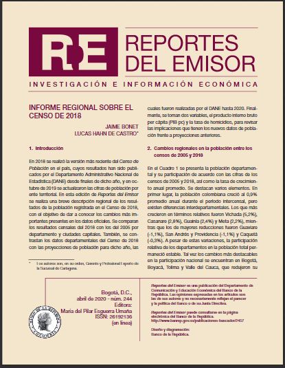 En 2018 se realizó la versión más reciente del Censo de Población en el país, cuyos resultados han sido publicados por el Departamento Administrativo Nacional de Estadística (DANE) desde finales de dicho año, y en octubre de 2019 se actualizaron las cifras de población por ente territorial. En esta edición de Reportes del Emisor se realiza una breve descripción regional de los resultados de la población registrada en el Censo de 2018, con el objetivo de dar a conocer los cambios más importantes presentes en los datos oficiales. Se comparan los resultados censales del 2018 con los del 2005 por departamento y ciudades capitales. También, se contrastan los datos departamentales del Censo de 2018 con las proyecciones de población para dicho año, las cuales fueron realizadas por el DANE hasta 2020. Finalmente, se toman dos variables, el producto interno bruto per cápita (PIB pc) y la tasa de homicidios, para revisar las implicaciones que tienen los nuevos datos de población frente a proyecciones anteriores.