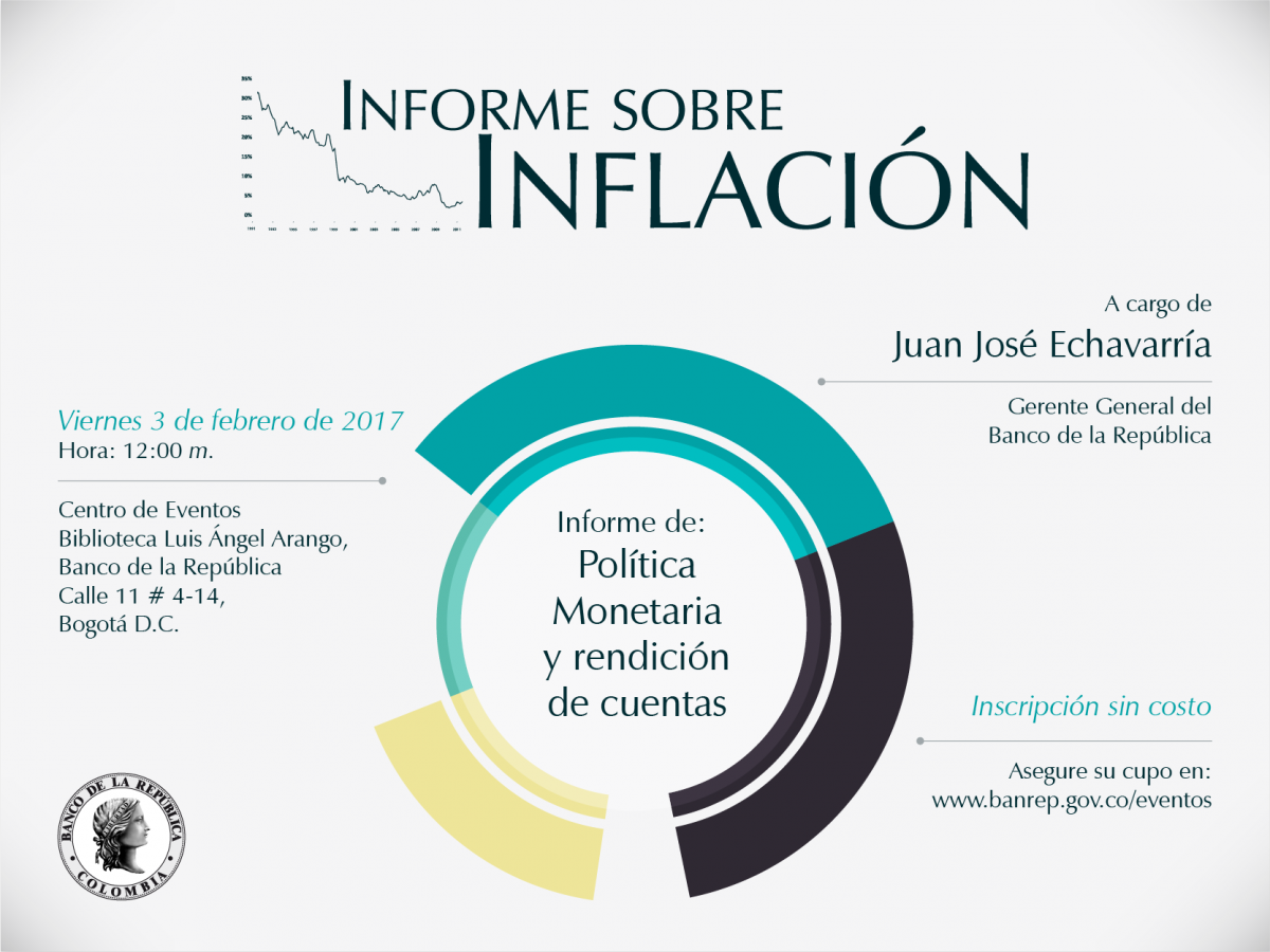 El Banco de la República lo invita el viernes 3 de febrero a la presentación "Informe de política monetaria y rendición de cuentas", evento que se realizará en Bogotá, en la Biblioteca Luis Ángel Arango del Banco de la República, calle 11 # 4-14, desde las 12:00 m., el cual será transmitido a su vez en directo por Canal Institucional (canal 9 de la televisión nacional) a partir de las 12:00 m.