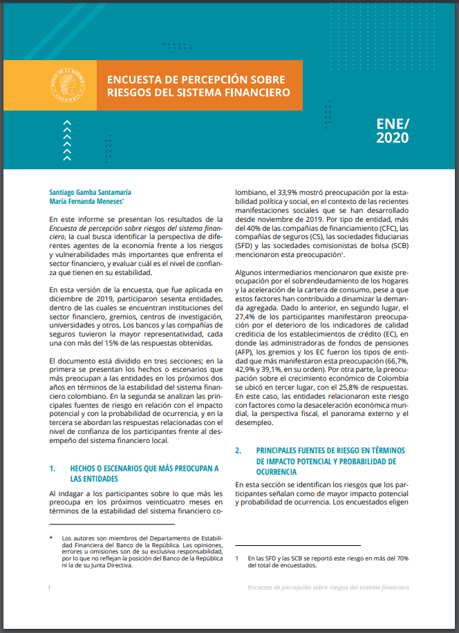 En este informe se presentan los resultados de la Encuesta de percepción sobre riesgos del sistema financiero, la cual busca identificar la perspectiva de diferentes agentes de la economía frente a los riesgos y vulnerabilidades más importantes que enfrenta el sector financiero, y evaluar cuál es el nivel de confianza que tienen en su estabilidad.