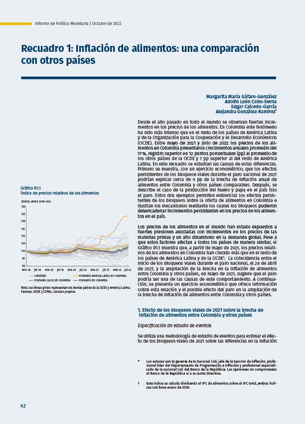 Desde el año pasado en todo el mundo se observan fuertes incrementos en los precios de los alimentos. En Colombia este fenómeno ha sido más intenso que en el resto de los países de América Latina y de la Organización para la Cooperación y el Desarrollo Económicos (OCDE). Entre mayo de 2021 y julio de 2022 los precios de los alimentos en Colombia presentaron crecimientos anuales promedio del 17%, registro superior en 12 puntos porcentuales (pp) al promedio de los otros países de la OCDE y 7 pp superior al del resto de América Latina. En este recuadro se estudian las causas de estas diferencias. Primero se muestra, con un ejercicio econométrico, que los efectos persistentes de los bloqueos viales durante el paro nacional de 2021 podrían explicar cerca de 9 pp de la brecha de inflación anual de alimentos entre Colombia y otros países comparables. Después, se describe el caso de la producción del huevo y papa en el país tras el paro. Estos dos ejemplos permiten evidenciar los efectos persistentes de los bloqueos sobre la oferta de alimentos en Colombia e ilustran los mecanismos mediante los cuales los bloqueos pudieron desencadenar incrementos persistentes en los precios de los alimentos en el país.