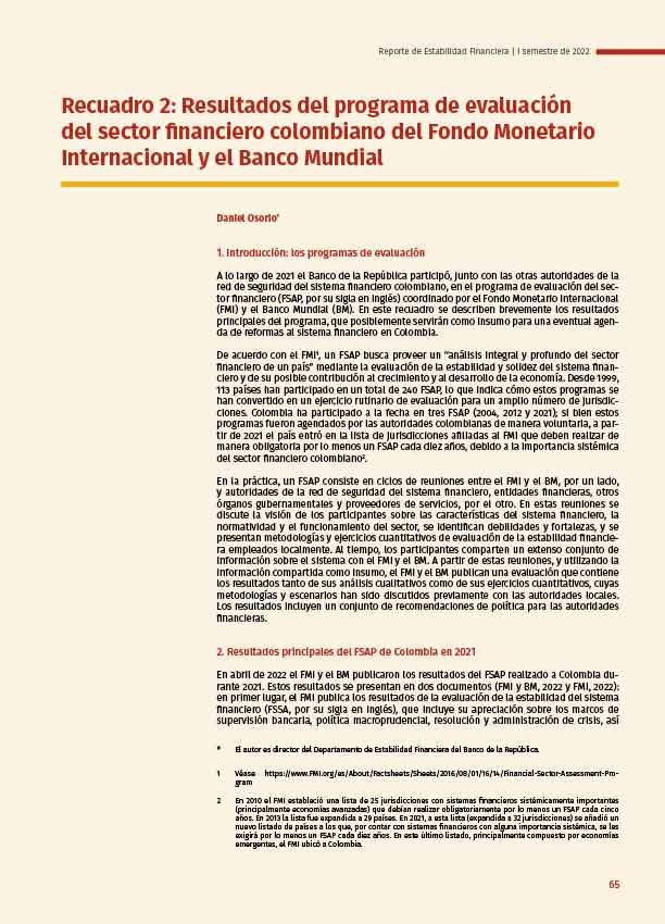 Recuadro 2: Resultados del programa de evaluación del sector financiero colombiano del Fondo Monetario Internacional y el Banco Mundial - Reporte de Estabilidad Financiera del primer semestre 2022