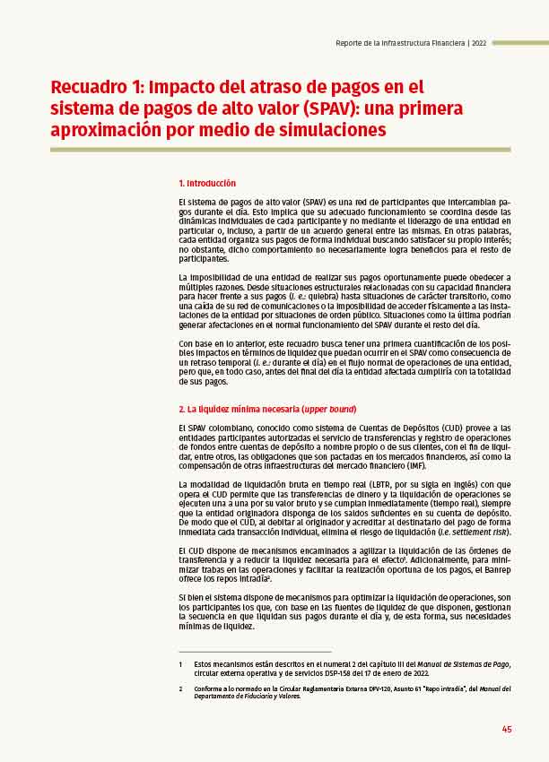Recuadro 1: Impacto del atraso de pagos en el sistema de pagos de alto valor (SPAV): una primera aproximación por medio de simulaciones - Reporte de Infraestructura Financiera - 2022