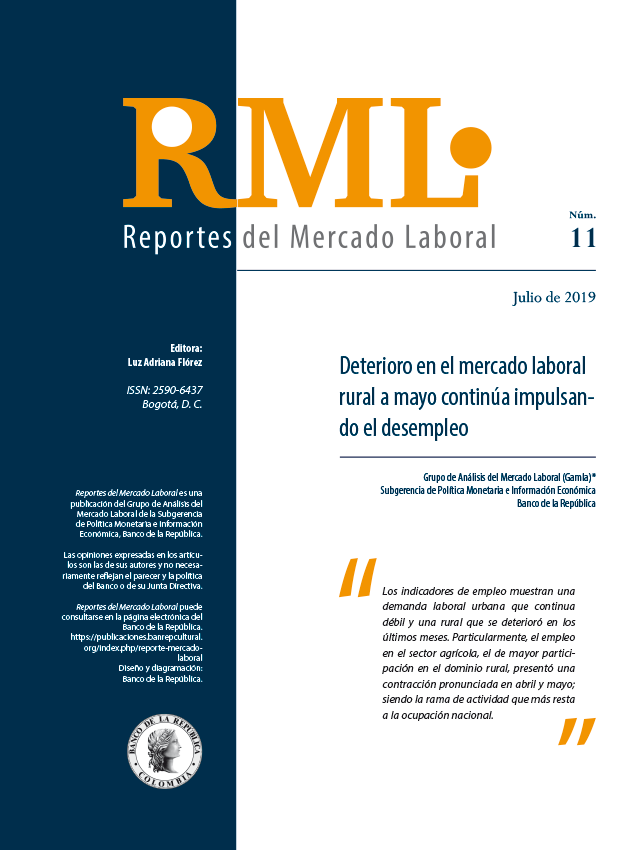 La serie de Reportes del Mercado Laboral (RML) es una publicación trimestral del Grupo de Análisis del Mercado Laboral (Gamla) del Banco de la República, creado en 2017. Las opiniones y posibles errores son responsabilidad exclusiva del autor y sus contenidos no comprometen al Banco de la República ni a su Junta Directiva.