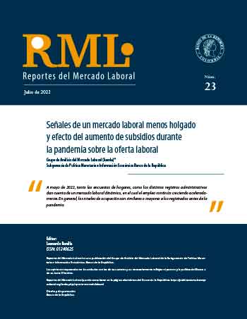 La serie de Reportes del Mercado Laboral (RML) es una publicación trimestral del Grupo de Análisis del Mercado Laboral (Gamla) del Banco de la República, creado en 2017. Las opiniones y posibles errores son responsabilidad exclusiva del autor y sus contenidos no comprometen al Banco de la República ni a su Junta Directiva.