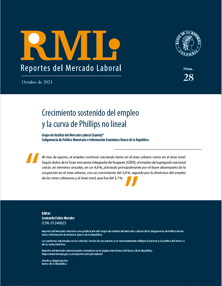 La serie de Reportes del Mercado Laboral (RML) es una publicación trimestral del Grupo de Análisis del Mercado Laboral (Gamla) del Banco de la República, creado en 2017. Las opiniones y posibles errores son responsabilidad exclusiva del autor y sus contenidos no comprometen al Banco de la República ni a su Junta Directiva.