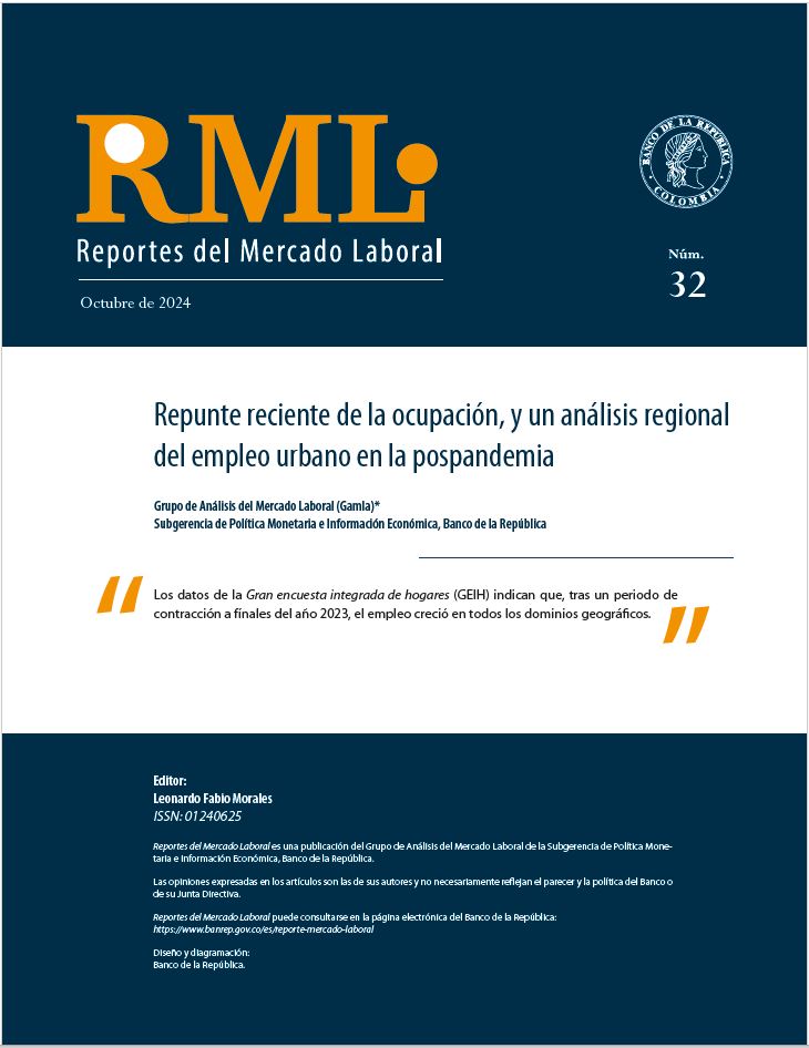 La serie de Reportes del Mercado Laboral (RML) es una publicación trimestral del Grupo de Análisis del Mercado Laboral (Gamla) del Banco de la República, creado en 2017. Las opiniones y posibles errores son responsabilidad exclusiva del autor y sus contenidos no comprometen al Banco de la República ni a su Junta Directiva.