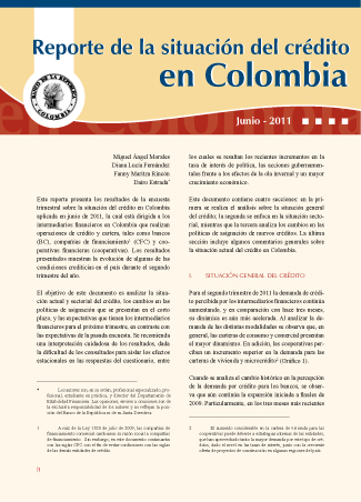 Este reporte presenta los resultados de la encuesta trimestral sobre la situación del crédito en Colombia aplicada en junio de 2011, la cual está dirigida a los intermediarios financieros en Colombia que realizan operaciones de crédito y cartera, tales como bancos (BC), compañías de financiamiento (CFC) y cooperativas financieras (cooperativas). Los resultados presentados muestran la evolución de algunas de las condiciones crediticias en el país durante el segundo trimestre del año.