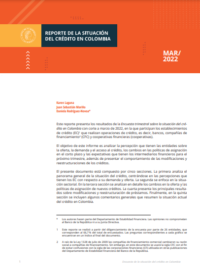 Este reporte presenta los resultados de la Encuesta trimestral sobre la situación del crédito en Colombia, en la que participan los intermediarios financieros que realizan operaciones de crédito, como bancos, compañías de financiamiento (CFC) y cooperativas financieras (cooperativas). El objetivo de este informe es analizar la percepción que tienen las entidades sobre la oferta, la demanda y el acceso al crédito, los cambios en las políticas de asignación en el corto plazo y las expectativas que tienen los intermediarios financieros para el próximo trimestre. Además de presentar el comportamiento de las modificaciones y reestructuraciones de los créditos. El presente documento está compuesto por cinco secciones. La primera analiza el panorama general de la situación del crédito, centrándose en las percepciones que tienen los EC con respecto a su demanda y oferta. La segunda se enfoca en la situación sectorial. En la tercera sección se analizan en detalle los cambios en las políticas de asignación de nuevos créditos. La cuarta presenta los principales resultados sobre modificaciones y reestructuración de préstamos. Finalmente, en la quinta sección se incluyen algunos comentarios generales que resumen la situación actual del crédito en Colombia.