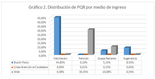Teniendo en cuenta que el Banco ha habilitado tres canales (atención presencial, atención telefónica y atención vía Web) para la recepción de PQR, el Gráfico 2 presenta la distribución de las solicitudes de acuerdo al medio de ingreso: