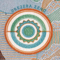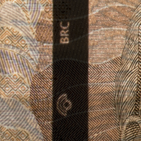 - IMAGEN OCULTA (LATENTE - Al lado izquierdo del rostro, en la franja de tonalidades café y naranja, al observar el billete en posición casi horizontal desde la esquina inferior derecha a la altura de los ojos, se visualiza el texto "BRC".