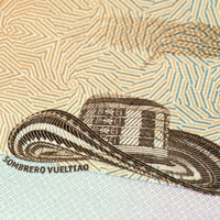 IMAGEN OCULTA (LATENTE - Al lado izquierdo del rostro, en la franja de tonalidades café y naranja, al observar el billete en posición casi horizontal desde la esquina inferior derecha a la altura de los ojos, se visualiza el texto "BRC".
