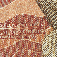 - A cada lado del rostro del presidente se encuentra una franja compuesta por ondulaciones: a la derecha una de color naranja, que incluye el texto "VEINTE MIL PESOS", y a la izquierda otra con tonalidades café y naranja, que incluye el texto "ALFONSO LÓPEZ MICHELSEN PRESIDENTE DE LA REPÚBLICA DE COLOMBIA (1974-1978)".