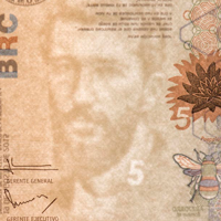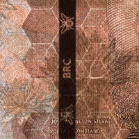 - En algunos hexágonos, ubicados a los lados del personaje, se encuentra los textos "BANCO DE LA REPÚBLICA" y "BRC".