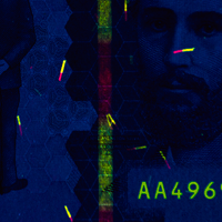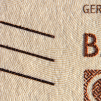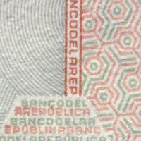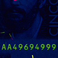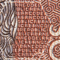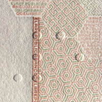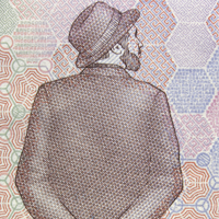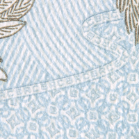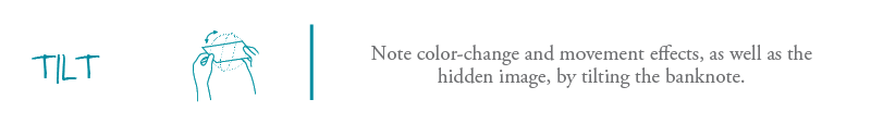 - HIDDEN IMAGE (latent) - When observing the banknote in an almost horizontal position at the height of the eyes from the lower right-hand corner, the text "BRC" can be seen on the blue turquoise strip at the left-hand side of the face.