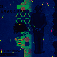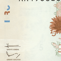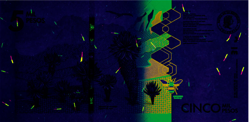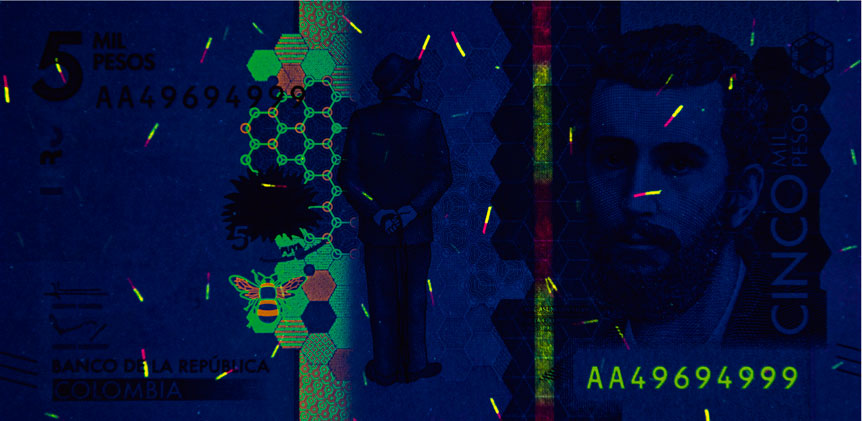 - In some hexagons, located to the sides of the character, the following texts are visible: "BANCO DE LA REPÚBLICA" and "BRC".