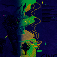 Some geometric figures and patterns, micro-texts and the bee fluoresce in orange and green.