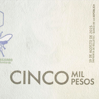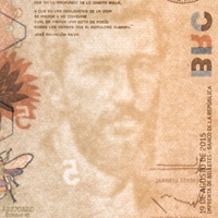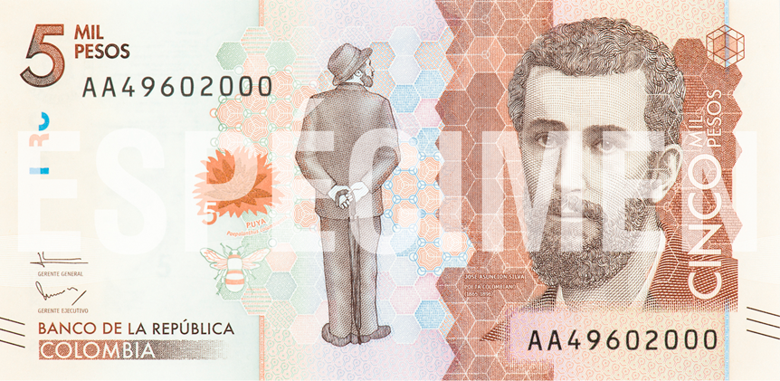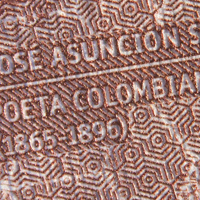 - On each side of the poet´s face there is a brown strip composed by hexagons, to the right it includes the text "CINCO MIL PESOS", and to the left it includes the text "JOSÉ ASUNCIÓN SILVA POETA COLOMBIANO (1865-1896)".