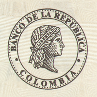 Two vertical lines, one brown to the left of the standing figure, and the other blue to the right of the face, with the text "BANCO DE LA REPÚBLICA"