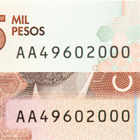 - COLOR VARIATION - The texts "5 MIL PESOS", "BANCO DE LA REPÚBLICA" and the background of the word "COLOMBIA" are printed in tones of brown.