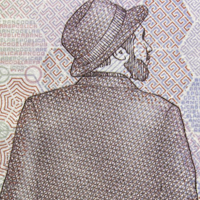 - WATERMARKS - On the left side of the banknote, the poet´s face can be seen against the light with a three-dimensional effect and the number "5".
