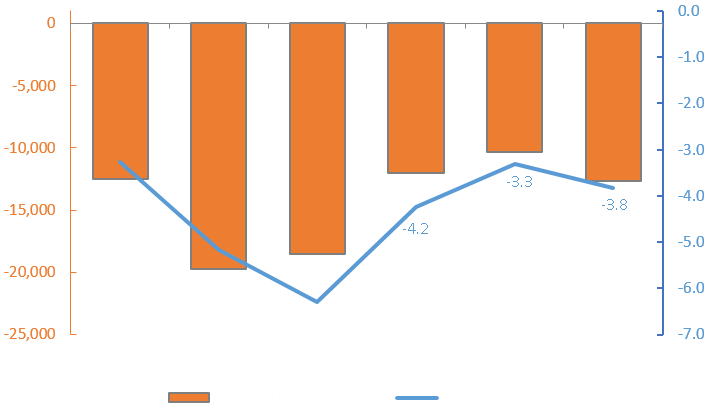 The technical team at the Bank forecasts the current account deficit to continue to grow, reaching a level slightly over 4.0% of GDP at the end of 2019 due to lower prices for Colombian coal and crude oil, as well as a moderation in the growth of exports of industrial goods (in the context of a global economic slowdown). Imports will continue to grow in 2019, though at a slower rate than in 2018. This is consistent with an environment in which internal demand grows more than GDP.