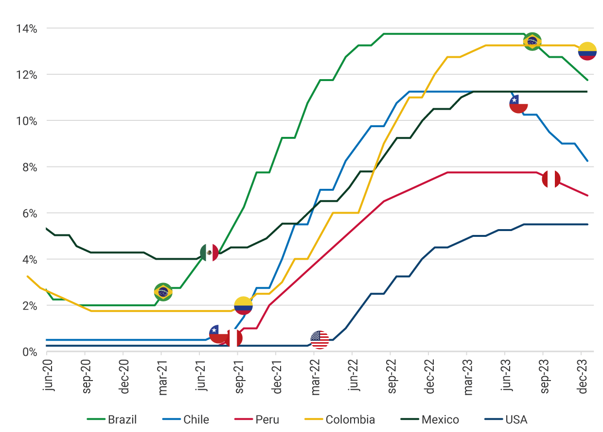 An alternative comparison could be made considering the deviation of inflation in each country with respect to its target. Chile, Colombia, and Mexico have a 3.0% target; Peru and the United States have a 2.0% target, and Brazil's target for 2021 was 3.75%. The deviations in percentage points (pp) compared to these targets at the beginning of the upward path of the interest rate in each country are shown in Table 1. This shows that Colombia, Chile, and Brazil began to react when their inflation rates were farther away from the target than Peru and Mexico, which took a little longer. The case of the United States stands out, as it waited to begin its rate hike cycle until its observed inflation was 5.9 pp above its target.