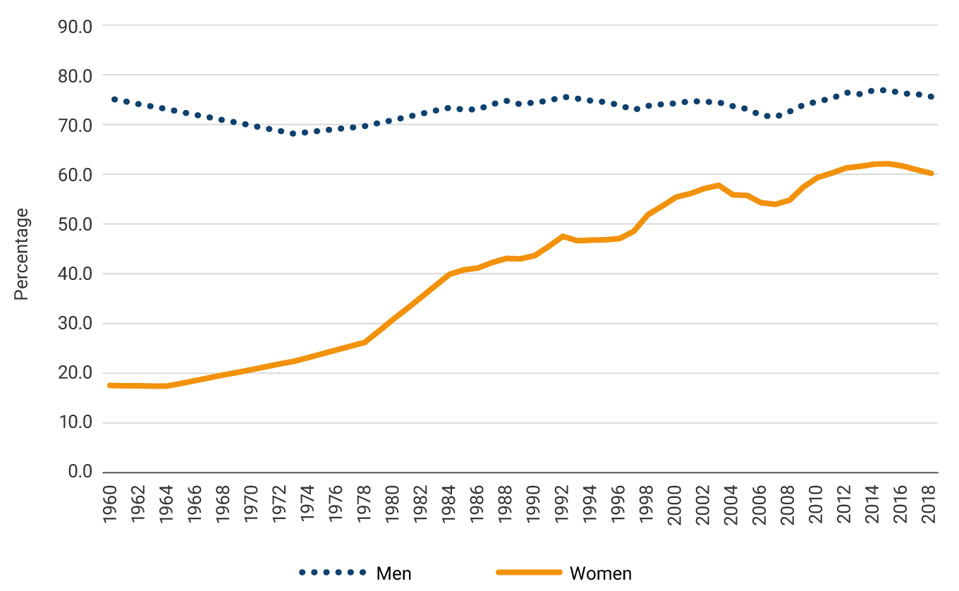 Graph 1. Male and female labor force participation rates, 1960-2018 (Seven-city average)