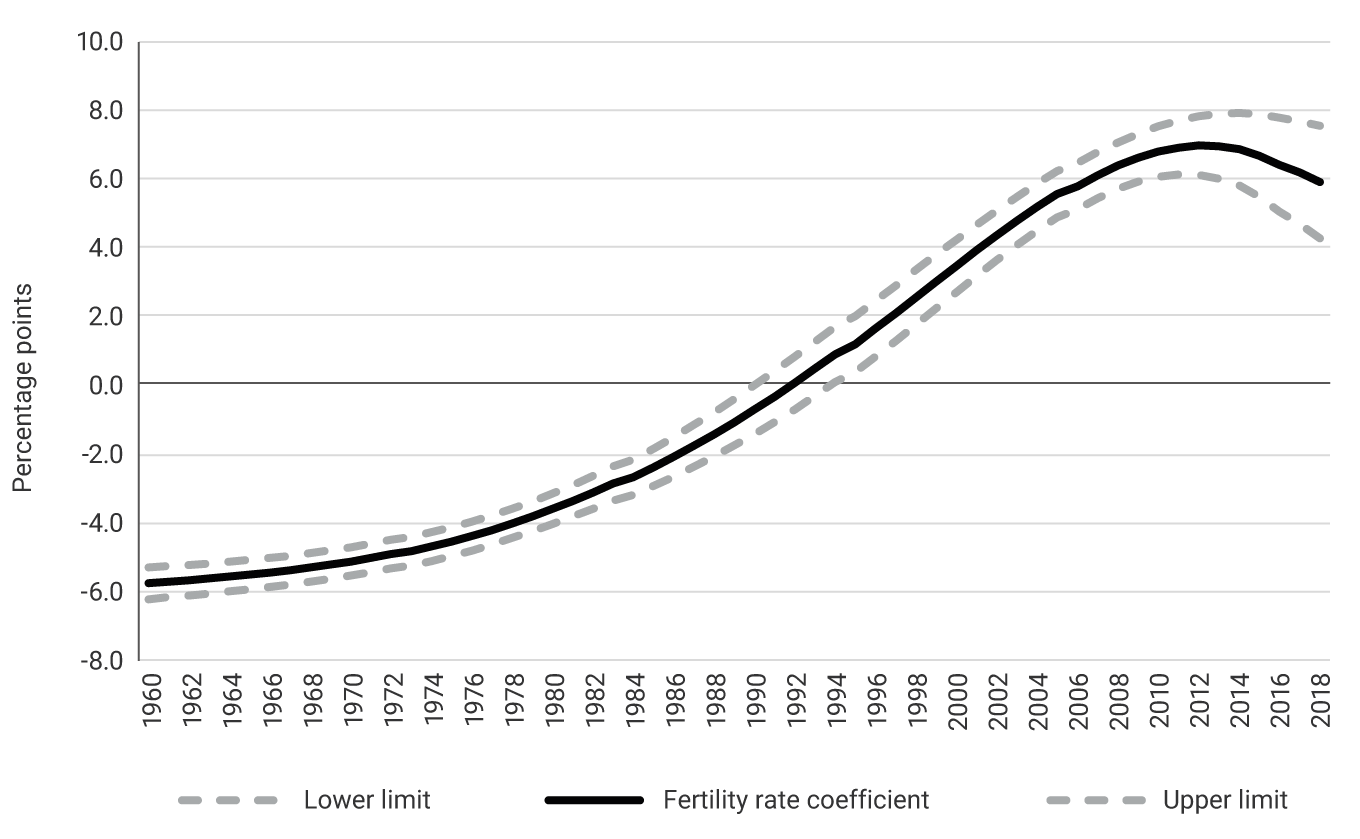 Note: The area between the lower limit and the upper limit indicates the confidence interval for the effect of the fertility rate.