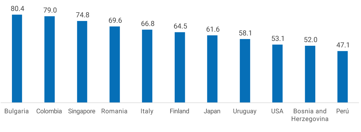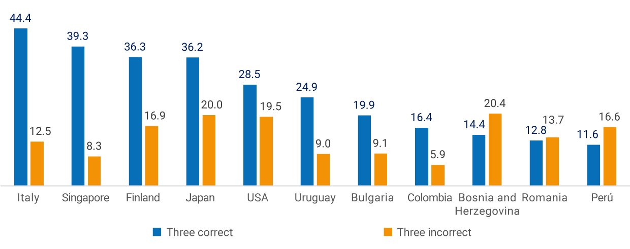 Graph 2 exhibits the fractions of respondents who answered correctly (blue) and incorrectly (orange) the three questions in various countries, including Colombia1. There seem to be significant differences: for example, only 16.4% of the Colombian population can answer the three key questions correctly, above Bosnia-Herzegovina (14.4%), Romania (12.8%), and Perú (11.6%), but below countries such as Italy (44.4%), Singapore (39.3%), Finland (36.3%), and Japan (36.2%). In turn, Colombia had the lowest level of combined incorrect answers (5.9%), followed by Singapore (8.3%), Uruguay (9.0%), and Bulgaria (9.1%). The case of developed countries such as Japan (20.0 %) and the United States (19.5%) is surprising since almost one-fifth of the respondents answered some of the financial knowledge questions incorrectly.