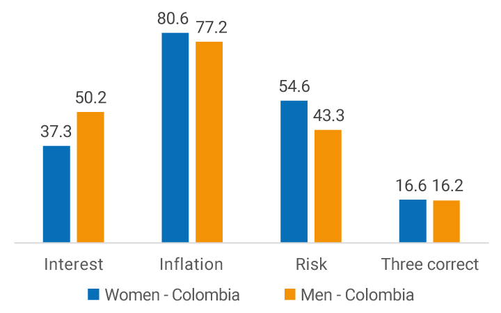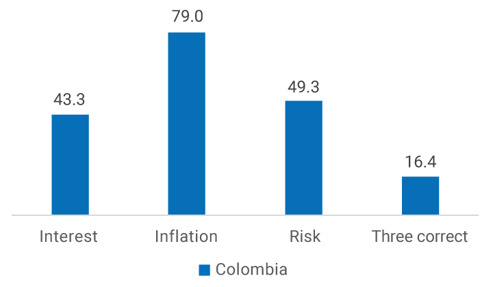 A high percentage of respondents chose the correct answer to each question (Graph 1). However, less than half of the population answered the interest rate question correctly (43.3%), and close to half answered the question related to risk diversification (49.3%) correctly. On the contrary, Colombians' knowledge of the concept of inflation stands out with a high percentage of correct answers (79%), which is even higher than in several developed countries.
