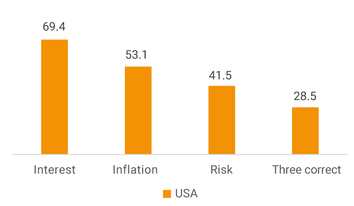 Graph 4 shows the results of the surveys conducted in the United States and Colombia, although one must be cautious in the comparisons because of what has already been noted2. In the case of the USA, their highest knowledge is on interest rates (69.4%), followed by inflation (53.1%) and risk diversification (41.5%). Compared to the results for Colombia, we see that the concept of inflation is the one most widely known (79%). It is curious, however, that Colombia obtained a better result in the question about risk diversification (49.3%) than the US. Regarding interest rates, the percentage of correct answers in Colombia (43.3%) is lower than in the United States, as expected, partly due to lower financial education and less exposure to financial credit products.